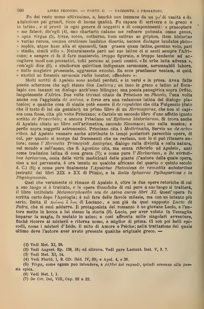 Quel che veramente ci rimane di Apuleio è, oltre le due opere retor che di cui a suo luogo si è trattato, e le opere filosofiche di cui pure a suo luogo si tratterà, il libro intitolato Metamorphoseòn seu de Asino aureo libri XI. Quest' opera fu scritta certo dopo l'Apologia, è sul fare delle favoie milesie, ma con ur intento più serio. Imita il Aov'xio; % ovo? di Luciano , e non già da quel supposto Lucio di Patre, che si suol addurre. Il protagonista del romanzo è un giovane Luc'o, e l'autore mette in bocca a lui stesso la storia (9). Lucio, per aver voluto in Tessaglia imparar la magia., fu mutato in asino; e così affronta mille singolari avventure, finché ricorre ai misterii e ritorna uomo, e miglior di prima. Ci son poi belli epi-sodii, come i misteri d'Iside, il mito di Amore e Psiche; nella trattazione del quale ultimo deve l'autore aver avuto presente qualche originale greco. —