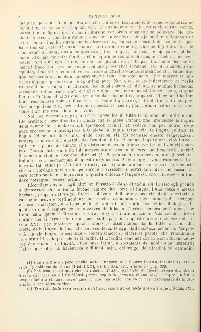 Noi non vorremo oggi per certo convenire in tutte le opinioni del dotto e sottile aretino, e specialmente in quella che la plebe romana non intendesse la lingua delle commedie, e andasse agli spettacoli scenici per vedere non per udire. Neppure crederemo inintelligibile alla plebe la lingua letteraria, la lingua politica, la lingua del senato, de'comizi, delle concioni (1). Ma remosse queste esagerazioni, resterà sempre nella epistola del Bruni un fatto di somma importanza, cioè l'avere e 'di per il primo accennato alla distinzione tra la lingua scritta e il dialetto parlato. Questa distinzione da lui intraveduta e secondo le forze sue dimostrata, aprirà il campo a studi e ricerche ulteriori (2). Seguiamo intanto brevemente gli scrittoli italiani che si occuparono di questo argomento. Poiché oggi sventuratamente l'onore di tali studi passò in altre terre, raccogliamo almeno con amore le memorie che ci ricordano quello che pensarono e scrissero i nostri antichi: e ciò possa essere eccitamento e rimprovero a questa odierna « leggerezza che ci fa essere ultimi dove potremmo essere primi.»