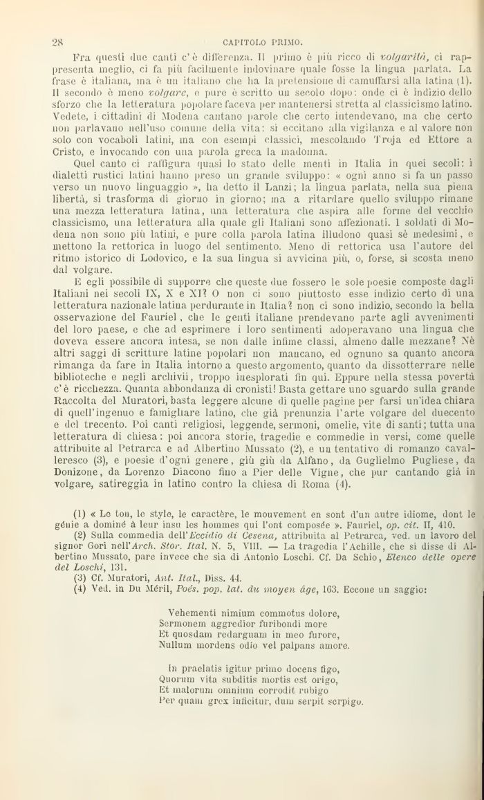 È egli possibile di supporre che queste due fossero le sole poesie composte dagli Italiani nei secoli IX, X e XI? 0 non ci sono piuttosto esse indizio certo di una letteratura nazionale latina perdurante in Italia? non ci sono indizio, secondo la bella osservazione del Fauriel . che le genti italiane prendevano parte agli avvenimenti del loro paese, e che ad esprimere i loro sentimenti adoperavano una lingua che doveva essere ancora intesa, se non dalle infime classi, almeno dalle mezzane? Ilò altri saggi di scritture latine popolari non mancano, ed ognuno sa quanto ancora rimanga da fare in Italia intorno a questo argomento, quanto da dissotterrare nelle biblioteche e negli archivii, troppo inesplorati fin qui. Eppure nella stessa povertà c'è ricchezza. Quanta abbondanza di cronisti! Basta gettare uno sguardo sulla grande Raccolta del Muratori, basta leggere alcune di quelle pagine per farsi un'idea chiara di quell'ingenuo e famigliare latino, che già prenunzia l'arte volgare del duecento e del trecento. Poi canti religiosi, leggende, sermoni, omelie, vite di santi ; tutta una letteratura di chiesa : poi ancora storie, tragedie e commedie in versi, come quelle attribuite al Petrarca e ad Albertino Mussato (2), e un tentativo di romanzo cavalleresco (3), e poesie d'ogni genere, giù giù da Alfano, da Guglielmo Pugliese, da Donizone, da Lorenzo Diacono fino a Pier delle Vigne, che pur cantando già in volgare, satireggia in latino contro la chiesa di Roma (4).