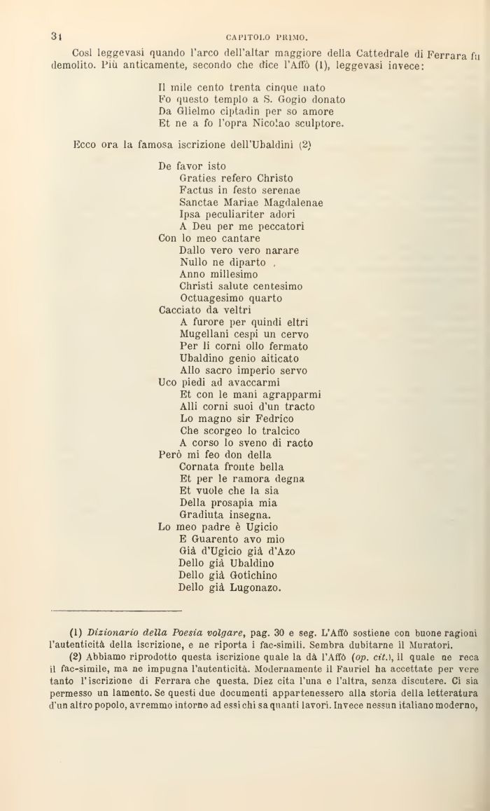 (2) Abbiamo riprodotto questa iscrizione quale la dà l'Affò (op. cit.), il quale ne reca il fac-simile, ma ne impugna l'autenticità. Modernamente il Fauriel ha accettate per vere tanto l'iscrizione di Ferrara che questa. Diez cita l'una e l'altra, senza discutere. Ci sia permesso un lamento. Se questi due documenti appartenessero alla stona della letteratura d'un altro popolo, avremmo intorno ad essi chi sa quanti lavori. Invece nessun italiano moderno.