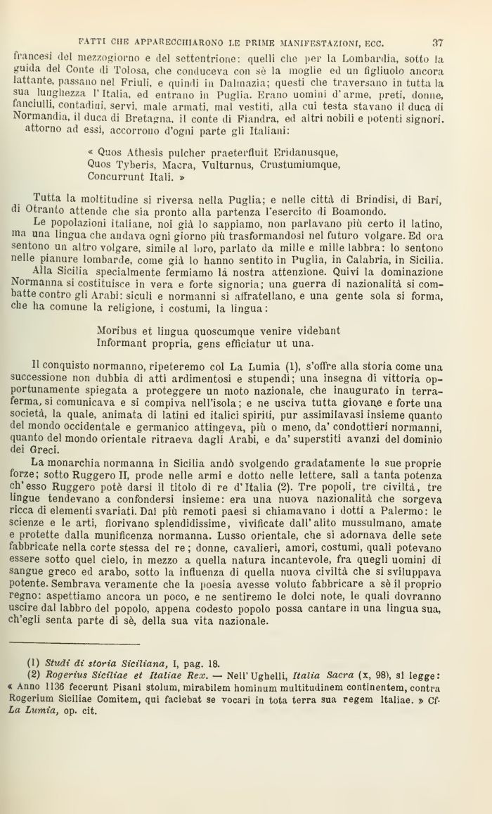 Alla Sicilia specialmente fermiamo là nostra attenzione. Quivi la dominazione Normanna si costituisce in vera e forte signoria; una guerra di nazionalità si combatte contro gli Arabi: siculi e normanni si affratellano, e una gente sola si forma, che ha comune la religione, i costumi, la lingua: