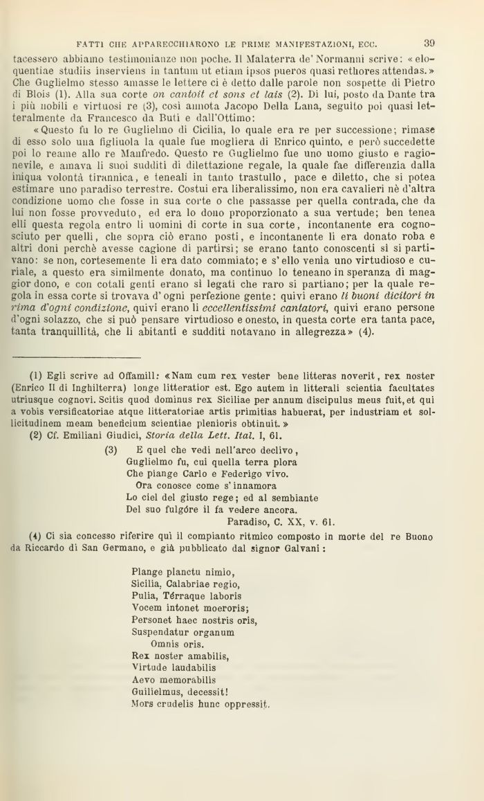 tacessero abbiamo testimonianze non poche. Il Malaterra de'Normanni scrivo: « elo-quentiae studiis inserviens in tantum ut etiain ipsos pueros quasi rethores attendas. » Che Guglielmo stesso amasse le lettere ci è detto dalle parole non sospette di Pietro di Blois (1). Alla sua corte on ccintoit et sons et lais (2). Di lui, posto da Dante tra i più nobili e virtuosi re (3), così annota Jacopo Della Lana, seguito poi quasi letteralmente da Francesco da Buti e dall'Ottimo: