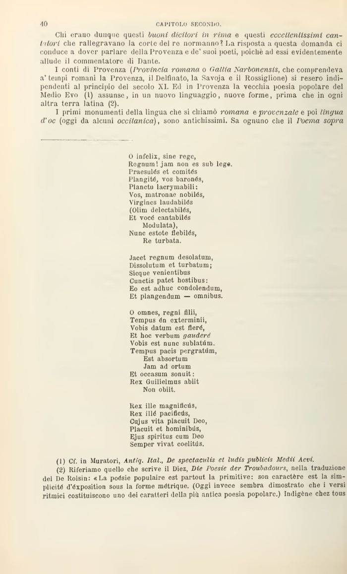 (2) Riferiamo quello che scrive il Diez, Die Poesie der Troubadours, nella traduzione del De Roisin: «La poésie populaire est partout la primitive: son caractère est la sim-plicité d'éxposition sous la forme métrique. (Oggi invece sembra dimostrato che i versi ritmici costituiscono uno dei caratteri della più antica poesia popolare.) Indigène chez tous