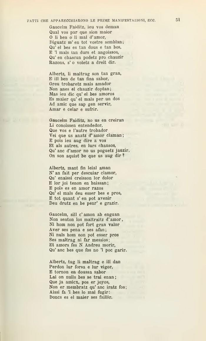 Gaucelm Faiditz, ieu vos deman Qual vos par quo sìon mator 0 li ben o li mal d'amor, Diguatz M en tot vostre semblan, Qu' el bes es tan dous e tan bos, E '1 mais tan durs et angoissos, Qu' en chaseun podetz prò chauzir Razons, s' o voletz a dreit dir.