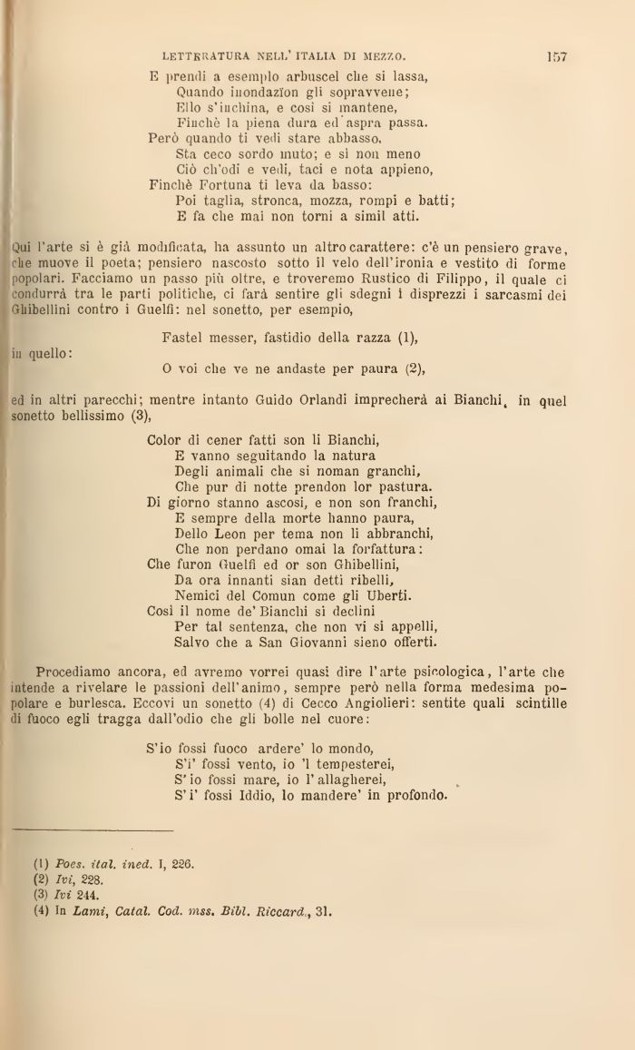 Procediamo ancora, ed avremo vorrei quasi dire l'arte psicologica, l'arte che intende a rivelare le passioni dell'animo, sempre però nella forma medesima popolare e burlesca. Eccovi un sonetto (4) di Cecco Angiolieri: sericite quali scintille di fuoco egli tragga dall'odio che gli bolle nel cuore: