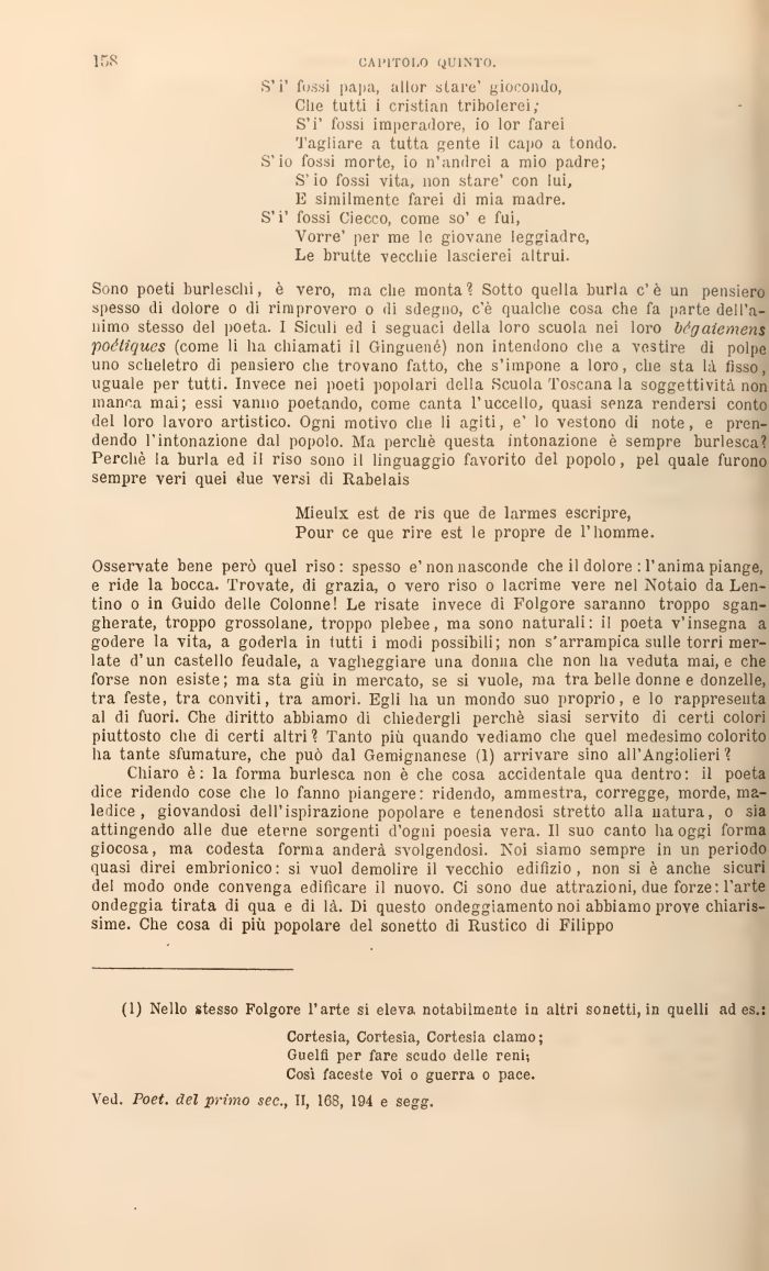 Sono poeti burleschi, è vero, ma che monta1? Sotto quella burla c'è un pensiero spesso di dolore o di rimprovero o di sdegno, c'è qualche cosa che fa parte dell'animo stesso del poeta. I Siculi ed i seguaci della loro scuola nei loro bàgaiemens poétiqucs (come li ha chiamati il Ginguené) non intendono che a vestire di polpe uno scheletro di pensiero che trovano fatto, che s'i inpone a loro, che sta là fisso uguale per tutti. Invece nei poeti popolari della Scuola Toscana la soggettività non manca mai; essi vanno poetando, come canta l'uccello, quasi senza rendersi conto del loro lavoro artistico. Ogni motivo che li agiti, e' lo vestono di note, e prendendo l'intonazione dal popolo. Ma perchè questa intonazione è sempre burlesca? Perchè la burla ed il riso sono il linguaggio favorito del popolo, pel quale furono sempre veri quei due versi di Rabelais