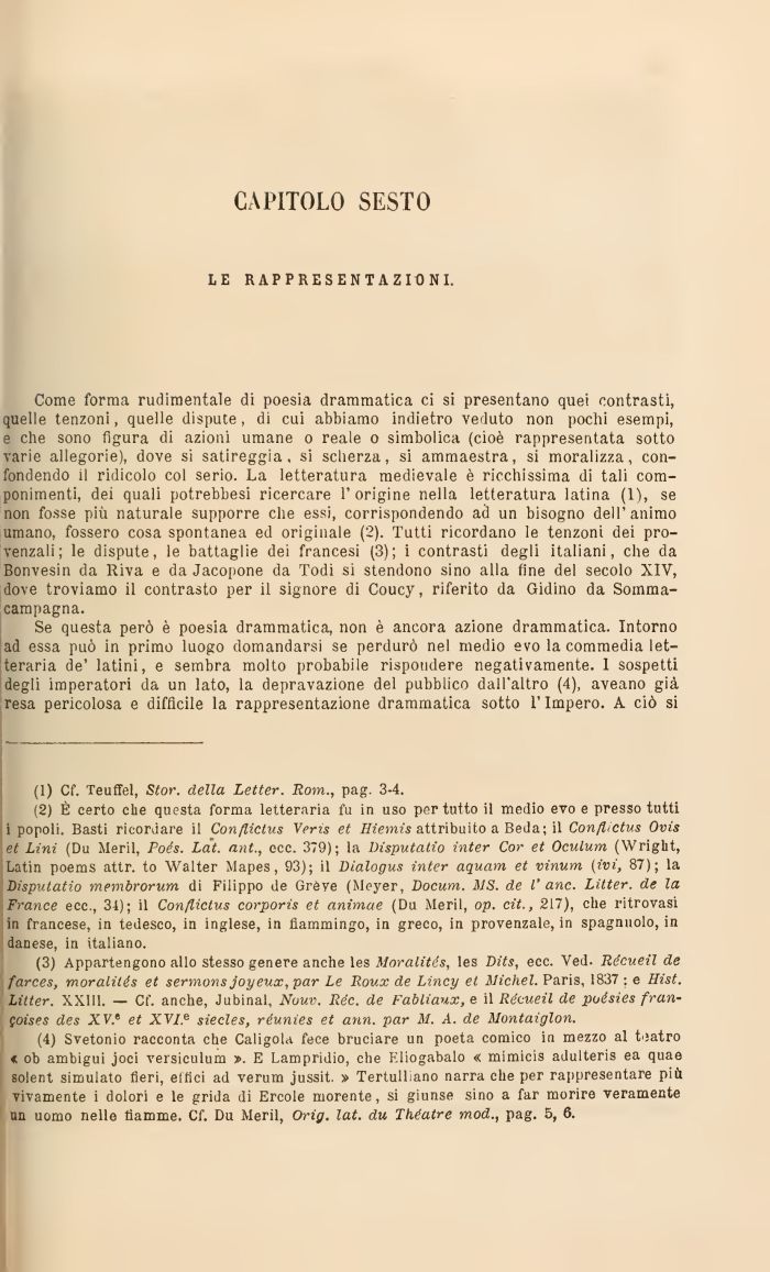 (4) Svetonio racconta che Caligola fece bruciare un poeta comico in mezzo al teatro « ob ambigui joci versiculum ». E Lampndio, che Eliogabalo « mimicis adulteris ea quae solent simulato fieri, effici ad verum jussit. » Tertulliano narra che per rappresentare più vivamente i dolori e le grida di Ercole morente, si giunse sino a far morire veramente un uomo nelle fiamme. Cf. Du Meril, Orig. lat. du Théatre ìnod., pag. 5, 6.