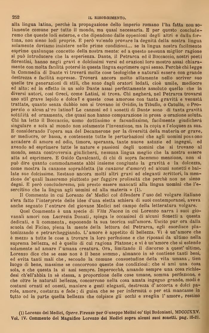 (1) Lorenzo dei Medici, Opere. Firenze per Giuseppe Molini co' tipi Bodoniani, xMDCCCXXV. Voi. W. Commento del Magnifico Lorenzo dei Medici sopra alcuni suoi sonetu. pag. 15-21.