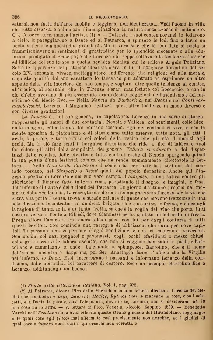 esterni, non fatta dall'arte mobile e leggiera, non idealizzata.... Vedi l'uomo in villa che tutto osserva, e anima con 1 immaginazione la natura senza averne il sentimento. Ci è l'osservatore, manca l'artista (1). » — Tuttavia i suo» contemporanei lo lodarono a cielo, lo pareggiarono a Dante ed al Petrarca, e spinsero le lodi fino a farne un poeta superiore a questi due grandi (AH Ma 1 vero si è che le lodi date al poeta si frammischiavano ai sentimenti di gratitudine per lo splendido mecenate o alle adulazioni prodigate al Principe; e che Lorenzo non seppe sollevare le tendenze classiche ed idilliche del suo tempo a quella squisita idealità cui le sollevò Angelo Poliziano. Sotto le apparenze del platonico idealista c'era in lu: il borghese fiorentino del secolo XV, sensuale, vivace, motteggiatore, indifferente alla religione ed alla morale, e queste qualità del suo carattere lo facevano pn, adattato ad esprimere un altro aspetto della vita interiore del suo tempo, e vogliam di~e quelle tendenze al comico, all'ironico, al sensuale che in Firenze s'eran manifestate col Boccaccio, e che in ciò ch'elle avevano di più essenziale erano decise negazioni dell'ascetismo e del misticismo del Medio Evo. — Nella Mencia da Barberino, nei Beoni e nei Canti carnascialeschi, Lorenzo il Magnifico realizza quest'altre tendenze in modo diverso e con diverse gradazioni.