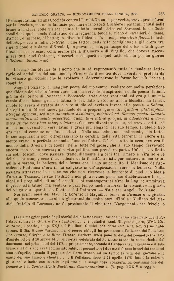 (1) La maggior parte degli storici della Letteratura italiana hanno affermato che il Poliziano scrisse la Giostra fra i quattórdici e i quindici anni. Ginguené, però, (Hist. litt. d'Italie, I partie , chap. XXJ e l'Emiliani Giudici (St. della lett. ital. lex. X) ne dubitarono. Il Sig. Giosuè Carducci nel discorso eh' egli ha premesso all'edizione del Poliziano (Le Stanze, l'Orfeo e le Rime, Firenze, Barbera 1863) pone la data del poemetto tra il 26 d'aprile 1476 e il 26 aprile 1478. La giostra celebrata dal Poliziano t'u tenuta come risulta da' documenti nei primi mesi del 1478, e propriamente, secondo il Carducci tra il gennaio e il febbraio. « Il Poliziano avrà cominciato subito il poemetto, e i due canti furono lavori dei tre mesi sino all'aprde, quando il pugnale dei Pazzi troncò ad un tempo la vita del giovane e il cauto del suo amico e cliente .... Il Poliziano, dopo il 24 aprile 1478, lasciò la cetra e gli allori, e incise con lo stile degli storici la sanguinosa congiura. La continuazione del poemetto e il Conjuratioms Pactianae Commentarium ». (V. pag. XXXIV o segg.).