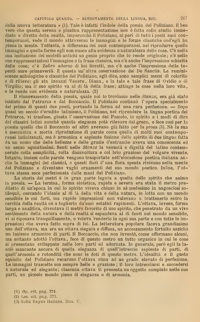 della nuova letteratura » (1). Tale è infatti l'indole della poesia del Poliziano. È ben vero che questa serena e plastica rappresentazione non è fatta collo studio immediato e diretto della realtà, imperocché il Poliziano, al pari di tutti i poeti suoi contemporanei, vede il mondo attraverso le immagini e le forme classiche ond'egli ha piena la mente. Tuttavia, a differenza dei suoi contemporanei, nel riprodurre quelle immagini e quelle forme egli non nuoce alla evidenza e naturalezza delle cose. C'è nella sua imitazione dei modelli antichi un genio propr o che lo rende originale; c'è nelle sue rappresentazioni 1 immagine o la frase classica, ma c'è anche l'impressione schietta delle cose; c'è Zefiro adorno di bei fioretti, ma c'è anche l'impressione delle te-penti aure primaverili. È questa un' altra osservazione del De Sanctis. Le reminiscenze mitologiche e classiche del Poliziano, egli dice, sono semplici mezzi di colorito e di rilievo: gli sta innanzi Venere, Diana, e la tale e tale frase di Ovidio o di Virgilio; ma il suo spirito va al di là della frase; attinge le cose nella loro vita, e le rende con evidenza e naturalezza. (2)