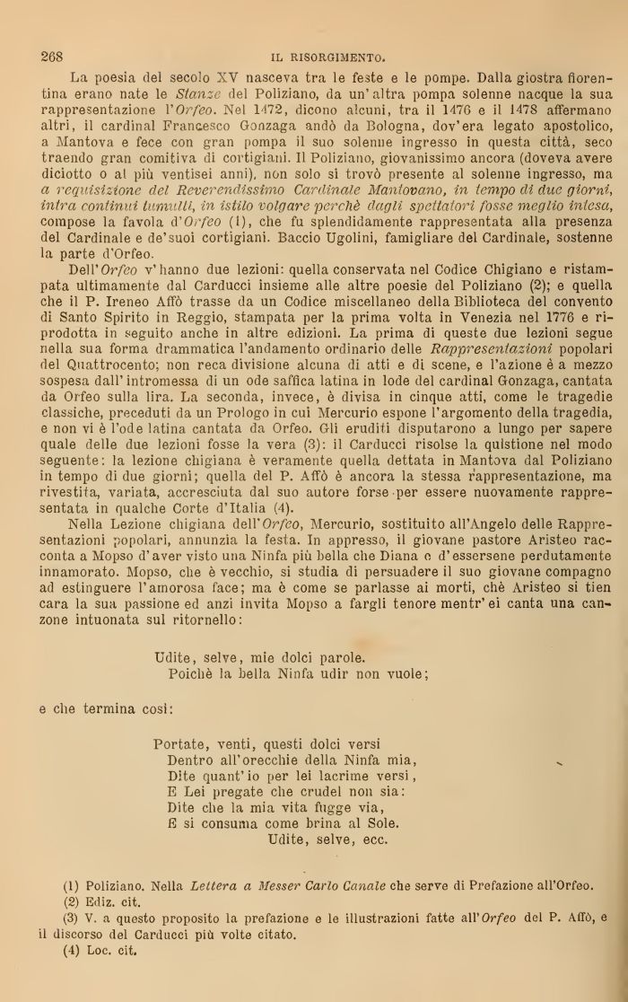 (3) V. a questo proposito la prefazione e le illustrazioni fatte all'Orfeo del P. Affò, e il discorso del Carducci più volte citato.