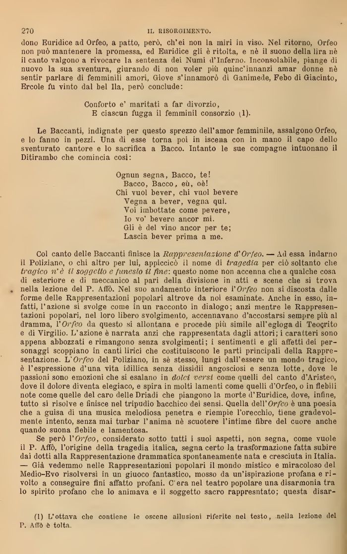 Se però VOrfeo, considerato sotto tutti i suoi aspetti, non segna, come vuole il P. Affò, l'origine della tragedia italica, segna certo la trasformazione fatta subire dai dotti alla Rappresentazione drammatica spontaneamente nata e cresciuta in Italia. — Già vedemmo nelle Rappresentazioni popolari il mondo miotico e miracoloso dei Medio-Evo risolversi in un giuoco fantastico, mosso da un'ispirazione profana e rivolto a conseguire fini affatto profani. C'era nel teatro popolare una disarmonia tra