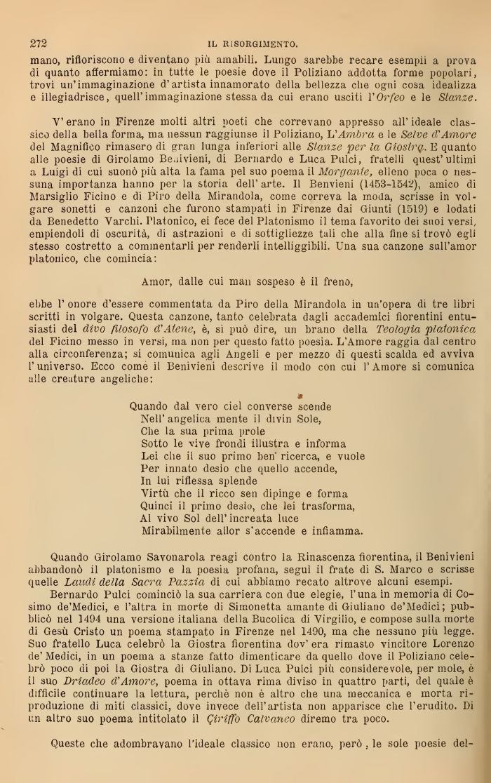 V' erano in Firenze molti altri noeti che correvano appresso all' ideale classico de1 la bella forma, ma nessun raggiunse il Poliziano, L'Ambra e le Selve cVAmore del Magnifico rimasero di gran lunga inferiori alle Stanze per la Giostrq,. E quanto alle poesie di Girolamo Beuivieni, di Bernardo e Luca Pulci, fratelli quest'ultimi a Luigi di cui suonò più alta la fama pel suo poema il Morganle, elleno poca o nessuna importanza hanno per la storia dell' arte. Il Benvieni (1453-1542), amico di Marsiglio Ficino e di Piro della Mirandola, come correva la moda, scrisse in volgare sonetti e canzoni che furono stampati in Firenze dai Giunti (1519) e lodati da Benedetto Varchi. Platonico, ei fece del Platonismo il tema favorito dei suoi versi, empiendoli di oscurità, di astrazioni e di sottigliezze tali che alla fine si trovò egli stesso costretto a commentarli per renderli intelliggibili. Una sua canzone sull'amor platonico, che comincia: