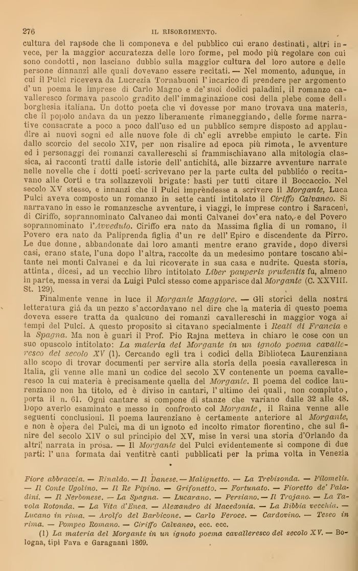 Finalmente venne in luce il Morgante Maggiore. — G-li storici della nostra letteratura già da un pezzo s'accordavano nel dire che la materia di questo poema doveva essere tratta da qualcuno dei romanzi cavallereschi in maggior voga a,i tempi del Pulci. A questo proposito si citavano specialmente i Reali di Francia e la Spagna. Ma non è guari il Prof. Pio Rajna metteva in chiaro le cose con un suo opuscolo intitolato: La materia dei Morgante in un ignoto poema cavalle-resco del secolo XV (1). Cercando egli tra i codici della Biblioteca Laurenziana allo scopo di trovar documenti per servire alla storia della poesia cavalleresca in Italia, gli venne alle mani un codice del secolo XV contenente un poema cavalleresco la cui materia è precisamente quella del Morgante. Il poema del codice lau-renziano non ha titolo, ed è diviso in cantari, 1' ultimo dei quali, non compiuto, porta il n. 61. Ogni cantare si compone di stanze che variano dalie 32 alle 48. Uopo averlo esaminato e messo in confronto col Morgante, il Raina venne alle seguenti conclusioni. Il poema laurenziano è certamente anteriore al Morgante, e non è opera del Pulci, ma di un ignoto ed incolto rimator fiorentino, che sul finire del secolo XIV o sul principio del XV, mise in versi una storia d'Orlando da altri! narrata in pròsa. — Il Morgante del Pulci evidentemente si compone di due