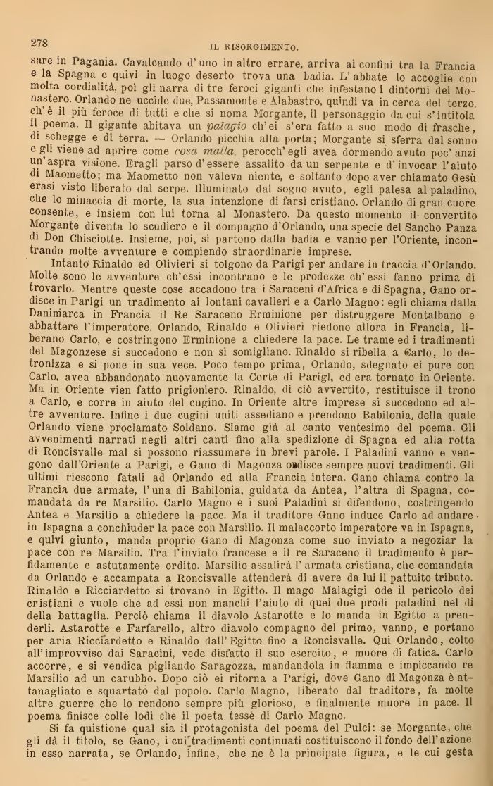 sare in Pagania. Cavalcando d' ano in altro errare, arriva ai confini tra la Francia e la Spagna e quivi in luogo deserto trova una badia. L' abbate lo accoglie con molta cordialità, poi gl narra di tre feroci giganti che infestano i dintorni del Monastero. Orlando ne uccide due, Passamonte e Alabastro, quindi va in cerca del terze eh'è il più feroce di tutti e che si noma Morgante, il personaggio da cui s'intitola' il poema. Il gigante abitava un palagio ch'ei s'era fatto a suo modo di frasche, di schegge e di terra. — Orlando picchia alla porta; Morgante si sferra dal sonno e gli viene ad aprire come cosa malia, perocch' egli avea dormendo avuto poc' anzi un'aspra visione. Eragli parso d'essere assalito da un serpente e d'invocar l'aiuto di Maometto; ma Maometto non valeva niente, e soltanto dopo aver chiamato Gesù erasi visto liberato dal serpe. Illuminato dal sogno avuto, egli palesa al paladino, che lo minaccia di morte, la sua intenzione di farsi cristiano. Orlando di gran cuoro onsente. e insiem con lui torna al Monastero. Da questo momento il- convertito Morgante diventa lo scudiero e il compagno d'Orlando, una specie del Sancho Panza di Don Chisciotte. Insieme, poi, si partono dalla badia e vanno per l'Oriente, incontrando molte avventure e compiendo straordinarie imprese.