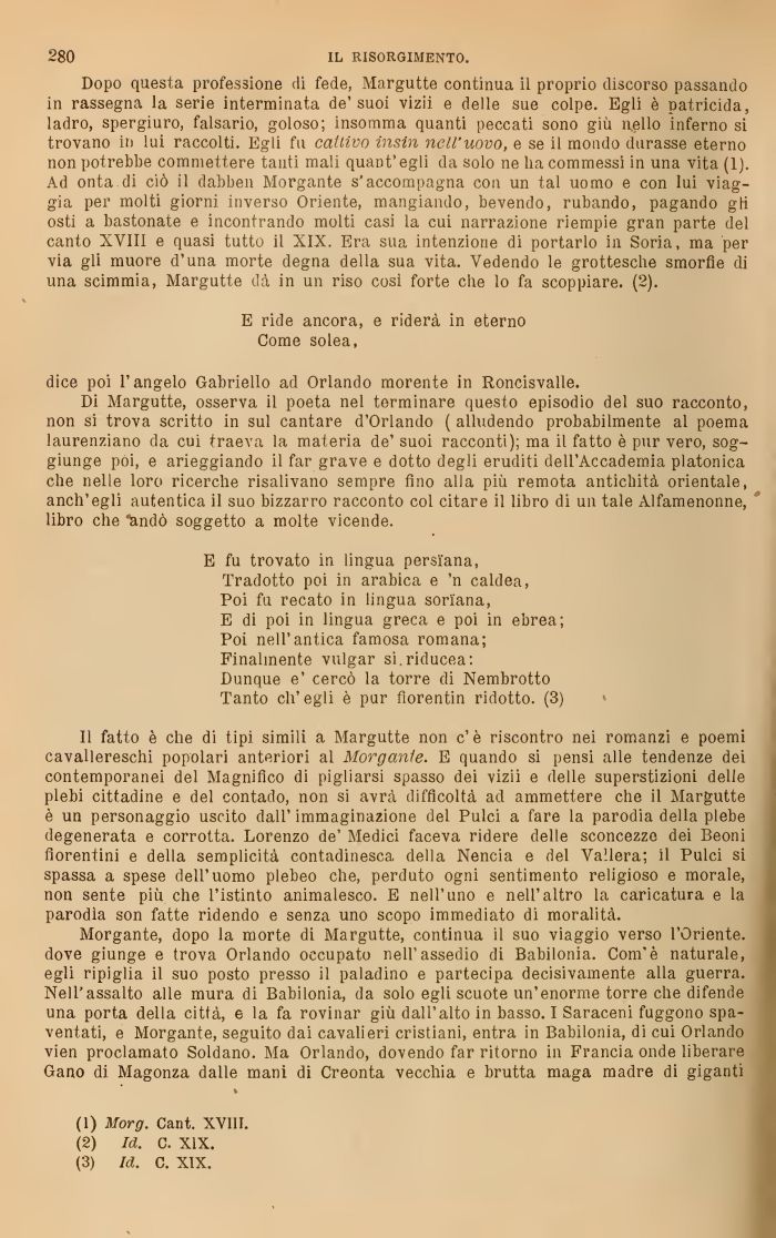 Dopo questa professione di fede, Margutte continua il proprio discorso passando in rassegna la serie interminata de'suoi vizii e delle sue colpe. Egli è patricida, ladro, spergiuro, falsario, goloso; insomma quanti peccati sono giù nello inferno si trovano in lui raccolti. Egli fu cattivo insin nell'uovo, e se il mondo durasse eterno non potrebbe commettere tanti ma'i quant'egli da solo ne ha commessi in una vita (I). Ad onta.di ciò il dabben Morgante s'accompagna con un tal uomo e con lui viaggia per molti giorni inverso Oriente, mangiando, bevendo, rubando, pagando gli osti a bastonate e incontrando molti casi la cui narrazione riempie gran parte del canto XVIII e quasi tutto il XIX. Era sua intenzione di portarlo in Soria, ma per via gli muore d'una morte degna della sua vita. Vedendo le grottesche smorfie di una scimni'a, Margutte dà in un riso così forte che lo fa scoppiare. (2).