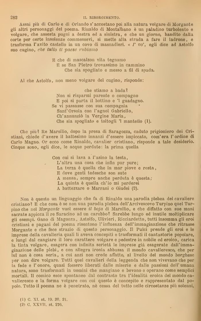 Assai più di Carlo e di Orlando s' accostano poi alla natura volgare di Morgante gli altri personaggi del poeiiia. Rinaldo di Montalbano è un paladino turbolento e volgare, che assesta pugni a destra ed a sinistra, e che un giorno, bandito dalla corte per certe insolenze commessevi, si mette alla strada a fare il ladrone, e trasforma l'avito castello in un covo di masnadieri. « /' vo', egli dice ad Astolfo suo cugino, che tutto il paese rubiamo
