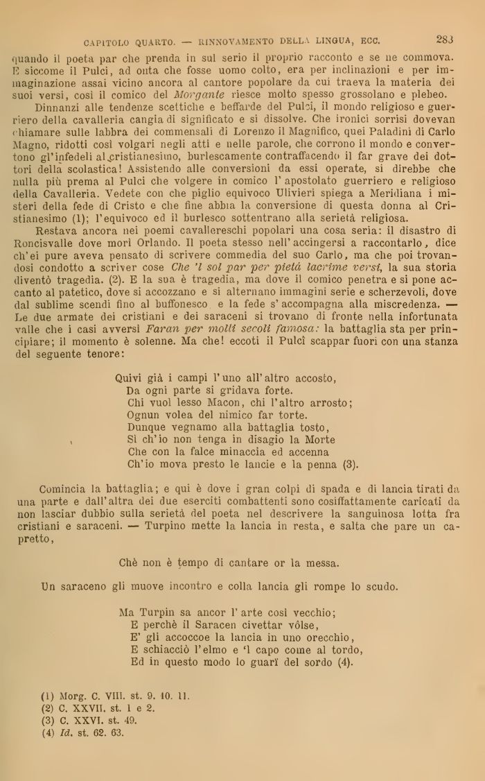 Comincia la battaglia; e qui è dove i gran colpi di spada e di lancia tirati da una parte e dall'altra dei due eserciti combattenti sono cosiffattamente caricati da non lasciar dubbio sulla serietà del poeta nel descrivere la sanguinosa lotta fra cristiani e saraceni. — Turpino mette la lancia in resta, e salta che pare un capretto ,
