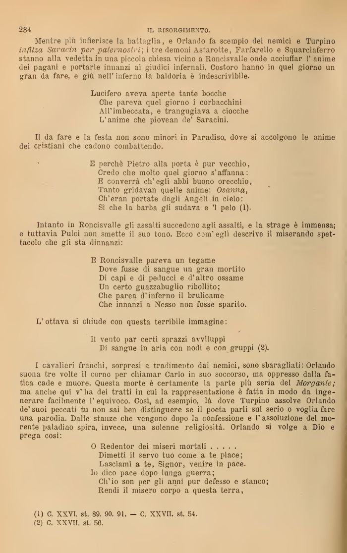I cavalieri franchi, sorpresi a tradimento dai nemici, sono sbaragliati: Orlando suona tre volte il corno per chiamar Carlo in suo soccorso, ma oppresso dalla fatica cade e muore. Questa morte è certamente la parte più seria del Morgante; ma anche qui v' ha dei tratti in cui la rappresentazione è fatta in modo da ingenerare facilmente l'equivoco. Così, ad esempio, là dove Turpino assolve Orlando de'suoi peccati tu non sai ben distinguere se il poeta parli sul serio o voglia fare una parodia. Dalle stanze che vengono dopo la confessione e 1' assoluzione del morente paladino spira, invece, una solenne religiosità. Orlando si volge a Dio e prega cosi: