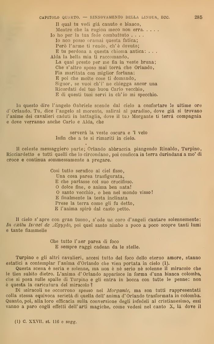 Questa scena è seria e solenne, ma non è nè serio nè solenne il miracolo che le tieu subito dietro. L'anima d'Orlando apparisce in forma d'una bianca colomba, che si posa sulle spalle di Turpino e gli entra in bocca con tutte le penne: non è questa la caricatura del miracolo ?