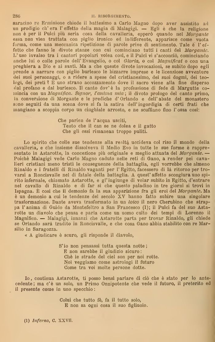 Lo spirito che colle sue tendenze alla realtà uccideva col riso il mondo della cavalleria, e che insieme dissolveva il Medio Evo in tutte le sue forme è rappresentato in Astarotte, la concezione più originale e meglio attuata del Morgante. — Poiché Malagigi vede Carlo Magno caduto nelle reti di Gano, a render pei cavalieri cristiani meno tristi le conseguenze della battaglia, egli vorrebbe che almeno Rinaldo e i fratelli di Rinaldo vaganti per 1'Egitto, facessero di là ritorno per trovarsi a Roncisvalle nel dì fatale della battaglia. A quest' affetto scongiura uno spirito infernale, chiamato Astarotte, e gl'ingiunge di volar subito n Egitto, d'entrare nel cavallo di Rinaldo e di far sì che questo paladino in tre giorni si trovi in Ispagna. È così che il demonio fa la sua apparizione fra gli eroi del Morgante. Ma è un demonio a cui le tendenze del secolo XV hanno fatto subire una singolare trasformazione. Dante aveva trasformato in un loico il nero Cherubino che strappa l'anima di Guido da Montefeltro a San Francesco (1); il Pulci fa del suo Asta-rotte un diavolo che pensa e parla come un uomo culto dei tempi di Lorenzo il Magnifico. — Malagigi, innanzi che Astarotte parta per trovar Rinaldo, gli chiede se Orlando sarà tradito in Roncisvalle, e che cosa Gano abbia stabilito con re Marsilio in Saragozza.