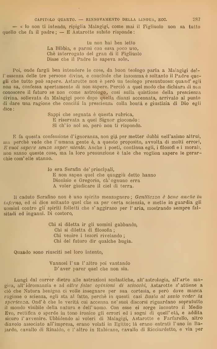 Lungi dal correr dietro alle astrazioni scolastiche, all'astrologia, all'arte magica, all'idromanzia e ad altre false opinioni di sciocchi, Astarotte s'attiene a ciò che Natura benigna ci volle insegnare per sua cortesia, e però dove manca ragione o scienza, egli sta al fatto, perchè in questi casi Basta al savio veder la sperienza. Ond' è che le verità cui accenna ne' suoi discorsi riguardano sopratutto il mondo visibile della natura e dell' uomo. Con esse ei sorge incontro il Medio Evo, rettifica o sperde in tono ironico gli errori ed i sogni di quell' età, e addita sicuro l'avvenire. Ubbidendo ai voleri di Malagigi, Astarotte e Farfarello, altro diavolo associato all'impresa, erano volati in Egitto; là erano entrati l'uno in Ba-jardo, cavallo di Rinaldo, e 1' altro in Rabicane, cavallo di Ricciardetto, e via per