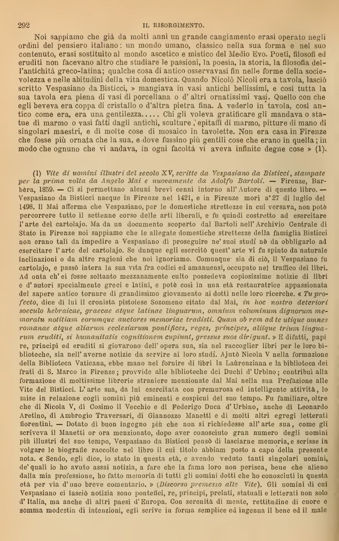 (1) Vite di uomini illustri del secolo XV, scritte da Vespasiano da Bisticci, stampate per la prima volta da Angelo Mai e nuovamente da Adolfo Bartolì. — Firenze, Barbèra, 1859. — Ci si permettano alcuni brevi cenni intorno all' Autore di quasto libro. — Vespasiano da Bisticci nacque in Firenze nel 1421, e in Firenze morì a'27 di luglio del 1498. Il Mai afferma che Vespasiano, per le domestiche strettezze in cui versava, non potò percorrere tutto il settenne corso delle arti liberali, e fu quindi costretto ad esercitare l'arte del cartolajo. Ma da un documento scoperto dal Bartoli nell'Archivio Centrale di Stato in Firenze noi sappiamo che le allegate domestiche strettezze della famiglia Bisticci non erano tali da impedire a Vespasiano di proseguire ne' suoi studi nè da obbligarlo ad esercitare 1' arte del cartolajo. Se dunque egli esercitò quest' arte vi fu spinto da naturale inclinazioni o da altre ragioni che noi ignoriamo. Comunque- sia di ciò, il Vespasiano fu cartolajo, e passò intera la sua vita fra codici ed amanuensi, occupato nel traffico dei libri. Ad onta eh' ei fosse soltanto mezzanamente culto possedeva copiosissime notizie di libri e d' autori specialmente greci e latini, e potè così in una età restauratrice appassionata del sapere antico tornare di grandissimo giovamento ai dotti nelle loro ricerche. « Tu prò-fedo, dice di lui il cronista pistoiese Sozomeno citato dal Mai, in hoc nostro deteriori soeculo hebraicae, graecae atque latinae linguarum, omnium voluminum dignorum me-moratu notitiam eorumque auctores memoriae tradisti. Quam ob rem ad te utique omnes romanae atque aliarum ecclesiarum pontifices, reges, principes, aliique trium lingua-rum eruditi, si humanitatis cognitionem cupìunt, gressus suos dirigunt. » E difatti, papi re, principi ed eruditi si giovarono dell' opera sua, sia nel raccoglier libri per le loro biblioteche, sia nell' averne notizie da servire ai loro studi. Ajutò Nicola V nella formazione della Biblioteca Vaticana, ebbe mano nel fornire di libri la Laùrenziana e la biblioteca dei frati di S. Marco in Firenze ; provvide alle biblioteche dei Duchi d' Urbino ; contribuì alla formazione di moltissimo librerie straniere menzionate dal Mai nella sua Prefazione alle Vite del Bisticci. L' arte sua, da lui esercitata con premurosa ed intelligente attività, lo mise in relazione cogli uomini più eminenti e cospicui del suo tempo. Fu familiare, oltre che di Nicola V, di Cosimo il Vecchio e di Federigo Duca d'Urbino, anche di Leonardo Aretino, di Ambrogio Traversari, di Giannozzo Manetti e di molti altri egregi letterati fiorentini. — Dotato di buon ingegno più che non si richiedesse all' arte sua, come gli scriveva il Manetti or ora menzionato, dopo aver conosciuto gran numero degli uomini più illustri del suo tempo, Vespasiano da Bisticci pensò di lasciarne memoria, e scrisse in volgare le biografie raccolte nel libro il cui titolo abbiam posto a capo della presente nota. « Sendo, egli dice, io stato in questa età, e avendo veduto tanti singolari uomini, de' quali io ho avuto assai notizia, a fare che la fama loro non perisca, bene che alieno dalla mia professione, ho fatto memoria di tutti gli uomini dotti che ho conosciuti in questa età per via d'uno breve comentario. » {Discorso premesso alle Vite). Gli uomini di cui Vespasiano ci lasciò notizia sono pontefici, re, principi, prelati, statuali e letterati non solo d'Italia, ma anche di altri paesi d'Europa. Con serenità di mente, rettitudine di cuore e somma modestia di intenzioni, egli scrive in forma semplice ed ingenua il bene ed il male