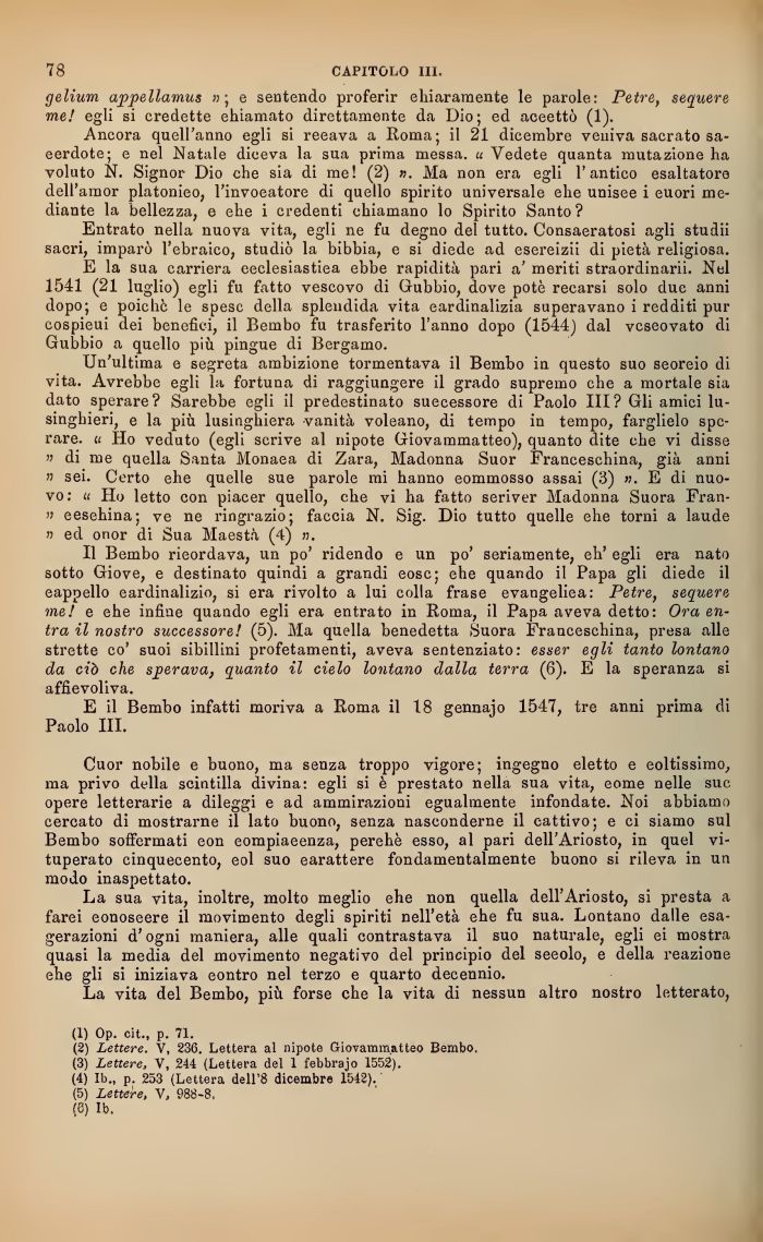 Cuor nobile e buono, ma senza troppo \igore; ingegno eletto e coltissimo, ma privo della scintilla divina: cgl: si è prestato nella sua vita, come nelle sue opere letterarie a dileggi e ad ammirazioni egualmente infondate. Noi abbiamo cercato di mostrarne il lato buono, senza nasconderne il cattivo; e ci siamo sul Bembo soffermati eon eompiaeenza, perehè esso, al pari dell'Ariosto, n quel vituperato cinquecento, eoi suo carattere fondamentalmente buono s rileva in un modo inaspettato.