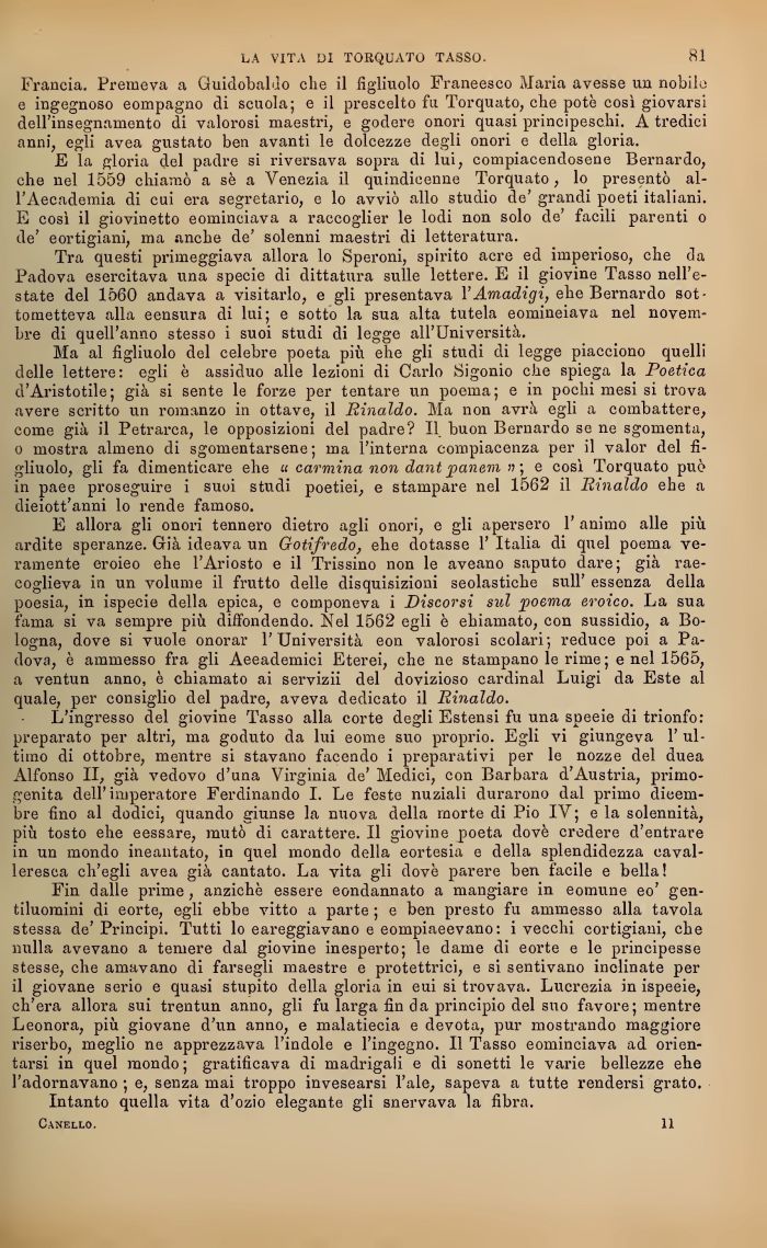 E la gloria del padre si riversava sopra di lui, compiacendosene Bernardo, che nel 1559 chiamò a sè a Venezia il quindicenne Torquato, lo presentò all'Accademia di cui era segretario, e lo avviò allo studio de' grandi poeti italiani. E così il giovinetto cominciava a raccoglier le lodi non solo de' facili parenti o de' cortigiani, ma anche de' solenni maestr. di letteratura.
