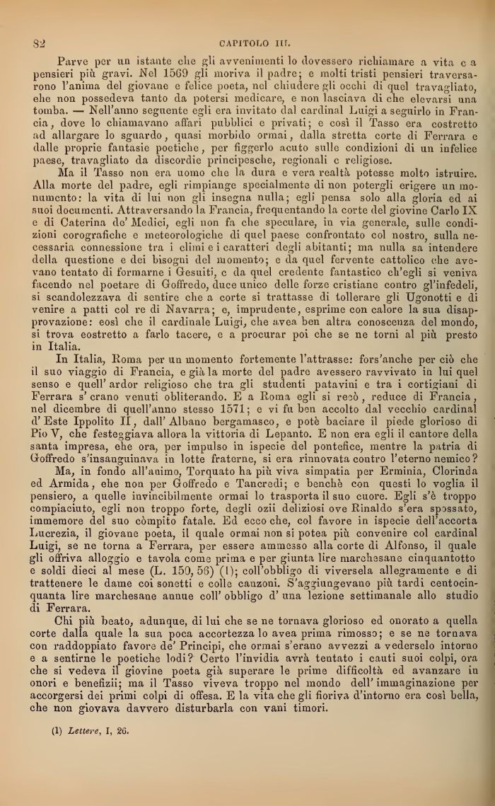 In Italia, Roma per un momento fortemente l'attrasse: fors'anche per ciò che il suo viaggio di Francia, e già la morte del padre avessero ravvivato in lui quel senso e quell' ardor religioso che tra gli studenti patavini e tra i cortigiani di Ferrara s' erano venuti obliterando. E a Roma egli si roò , reduce di Francia, nel dicembre di quell'anno stesso 1571; e vi fu ben accolto dal vecchio cardinal d'Este Ippolito II, dall'Albano bergamasco, e potè baciare il piede glorioso di Pio V, che festeggiava allora la vittoria di Lepanto. E non era egli il cantore della santa impresa, ehe ora, per impulso in ispecie del pontefice, mentre la patria di Goffredo s'insanguinava in lotte fraterne, si era rinnovata contro l'eterno nemico ?