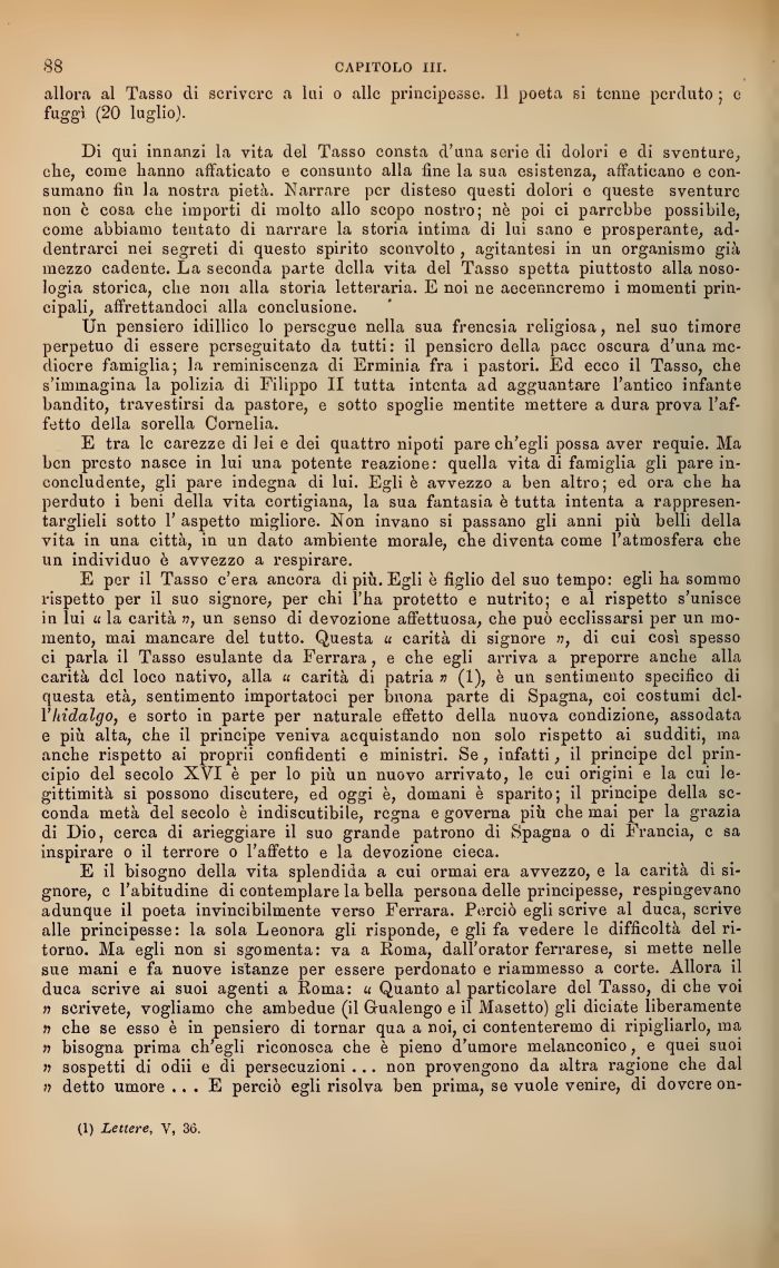 Di qui innanzi la vita del Tasso consta d'una serie di dolori e di sventure, che, come hanno affaticato e consunto alla fine la sua esistenza, affaticano e consumano fin la nostra pietà. Narrare per disteso questi dolori e queste sventure non c cosa che importi di molto allo scopo nostro; nè poi ci parrebbe possibile, come abbiamo tentato di narrare la storia intima di lui sano e prosperante, addentrarci nei segreti di questo spirito sconvolto , agitantesi in un organismo già mezzo cadente. La seconda parte della vita del Tasso spetta piuttosto alla nosologia storica, che non alla storia letteraria. E noi ne accenneremo i momenti principali, affrettandoci alla conclusione.