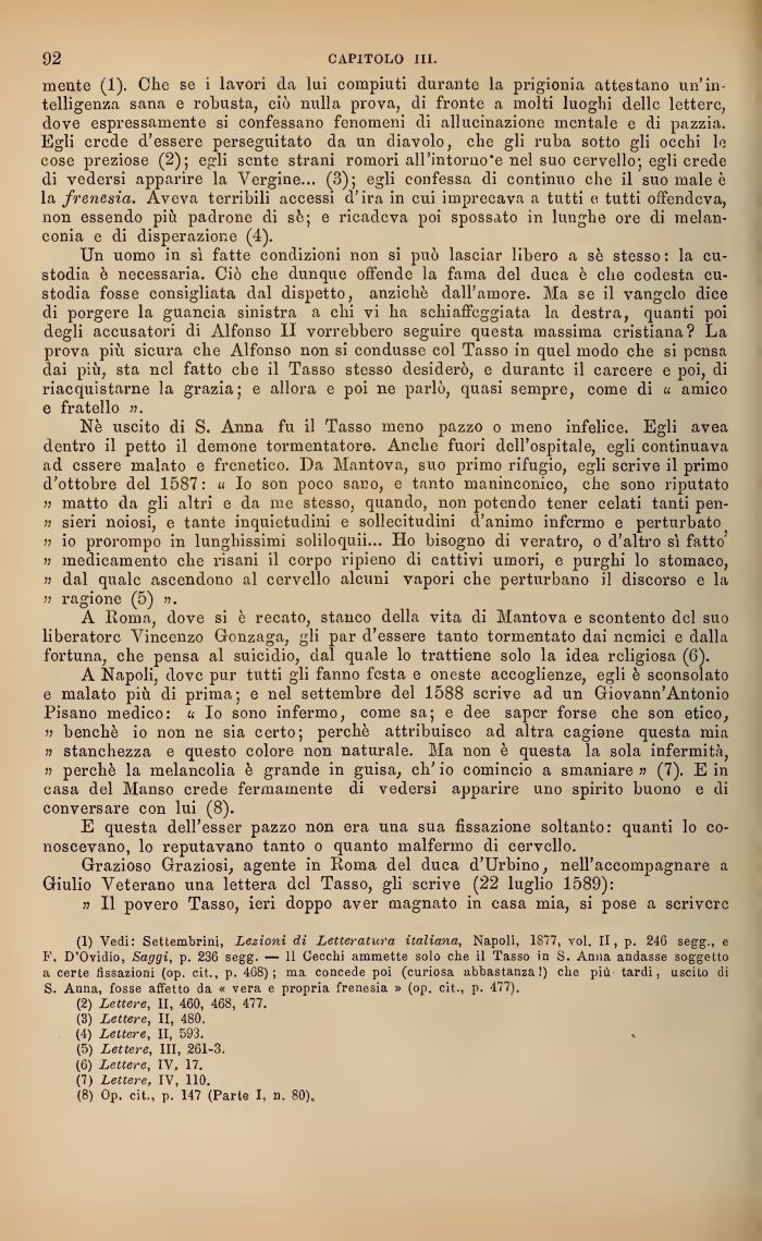(1) Vedi: Settembrini, Lezioni di Letteratura italiana, Napoli, 1877, voi. II, p. 240 segg., e F. D'Ovidio, Saggi, p. 23(3 segg. — 11 Oecchi ammette solo che il Tasso in S. Anna andasse soggetto a certe fissazioni (op. cit., p. 468); ma concede poi (curiosa abbastanza!) che più tardi, uscito di S. Anna, fosse affetto da « vera e propria frenesia » (op. cit., p. 477).