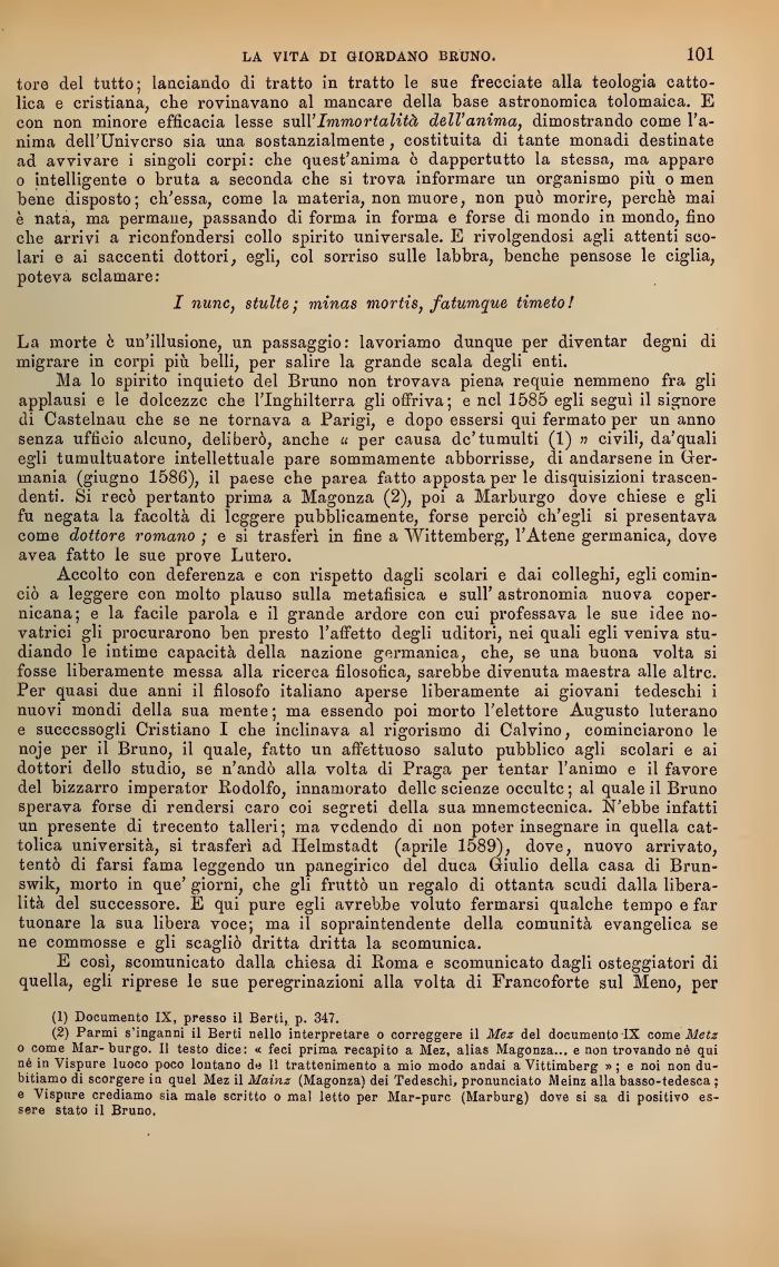 (2) Parmi s';ngann il Berti nello interpretare o correggere il Mez del documentoTX come Metz o comp Mar-brrgo. Il testo dice « feci prima recapito a Mez, alias Magonza... e non trovando uè qui né in Virpure luoco poco lontano de lì trattenimento a mio modo andai a Vittimberg »; e noi non dubitiamo Ui scorgere in quel Mez il Mainz (Magonzal dei Tedeschi, pronunciato Meinz alla basso-tedesca ; e Vi&pnre cv< Jiamo sia male scritto o mal letto per Mar-pure (Marburg) dove si sa di positivo essere stato il Bruno,