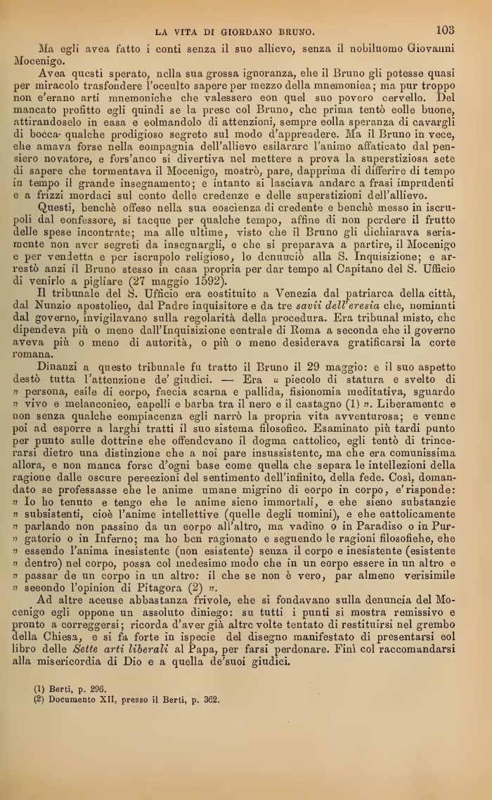 Avea questi sperato, nella sua grossa ignoranza, ehe il Bruno gli potesse quasi per miracolo trasfondere l'oceulto sapere per mezzo della mnemonica; ma pur troppo non e'erano arti mnemoniche che valessero eon quel suo povero cervello. Del mancato profitto egli quindi se la prese col Bruno, chc prima tentò eolle buone, attirandoselo in easa e colmandolo di attenzioni, sempre eolla speranza di cavargli di bocca qualche prodigioso segreto sul modo d'apprendere. Ma il Bruno in voce, ehe amava forse nella compagnia dell'allievo esilarare l'animo affaticato dal pensiero novatore, e fors'anco si divertiva nel mettere a prova la superstiziosa sete di sapere che tormentava il Mocenigo, mostrò, pare, dapprima di diiferire di tempo in tempo il grande insegnamento; e intanto si lasciava andare a frasi imprudenti e a frizzi mordaci sul conto delle credenze e delle superstizioni dell'allievo.