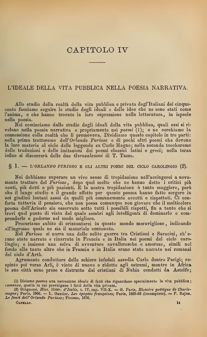 Noi cominciamo dallo studio degli ideali della vita pubblica, quali essi si rivelano nella poesia narrati ra e propriamente nei poemi (I), e ne cerchiamo la connessane colla realtà che li promoveva. Dividiamo questo capitolo in tre parti: nella prima tratteremo dell 'Orlando Furioso e (3- pochi altri poemi che devono la loro materia al ciclo delle leggende su Carlo Magno; nella seconda toccheremo delle traduzioni e delle imitazioni dei poemi classici latin, e greci; nella terza infine bi discorrerà delle due Gerusalemmi di T. Tasso.