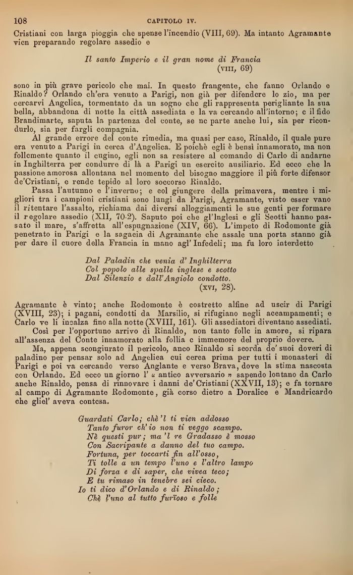 Ma, appena scongiurato il pencolo, anco Rinaldo i seorda de' suoi doveri di paladino per pensar solo ad Angeliea cui cerea prima per tutti i monasteri di Parigi e poi va cercando verso Anglante e verso Brava, dove la stima nascosta con Orlando. Ed ecco un giorno 1' u antico avversario n sapendo lontano da Carlo anche Rinaldo, pensa di rinnovare i danr de'Cristiani (XXVII, 13); e fa tornare al campo di Agramante Rodomonte, già corso dietro a Porafice e Mandricardo che gliel' aveva contesa.