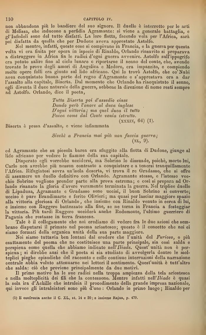 Noi siamo tuttavia ben lontani dal eredere che l'unità del Furioso, o più esattamente del poema che ne costituisce una parte principale, sia così salda e perspicua eome quella che abbiamo indicato nell'Iliade. Quest unità non è perspicua ; si direbbe anzi che il poeta si sia studiato di avvolgerla dentro le mol-teplie:' pieghe episodiche del raceonto e colle continue interruzioni della narrazione eentrale abbia voluto attenuarne nei lettori il sentimento. Quest'unità è tutt'altro ehe salda: ciò che proviene prireipalmente da due motivi.