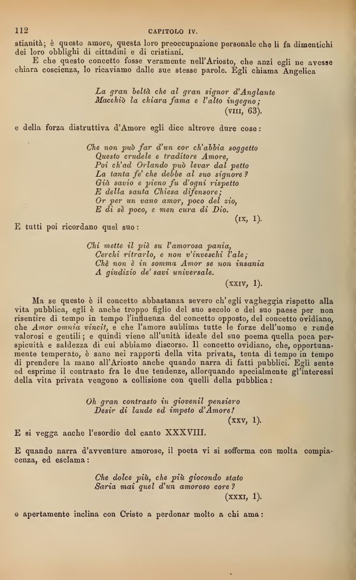 Ma se questo è il concetto abbastanza severo eh' egli vagheggia rispetto alla vita pubblica, egli è anche troppo figlio del suo secolo e del suo paese per non risentire di tempo in tempo l'influenza del concetto opposto, del concetto ovidiano, che Amor omnia vincit, e che l'amore sublima tutte le forze dell'uomo e rende valorosi e gentil1 e quindi viene all'unità ideale del suo poema quella poca perspicuità e saldezza di cui abbiamo discorso. 11 concetto ovidiano, che, opportunamente temperato, è sano nei rapporti della vita privata, tenta di tempo in tempo di prendere la mano all'Ariosto anche quando narra di fatti pubblici. Egli sente ed esprime il contrasto fra le due tendenze, allorquando specialmente gl'interessi della vita privata vengono a collisione con quelli della pubb ica :
