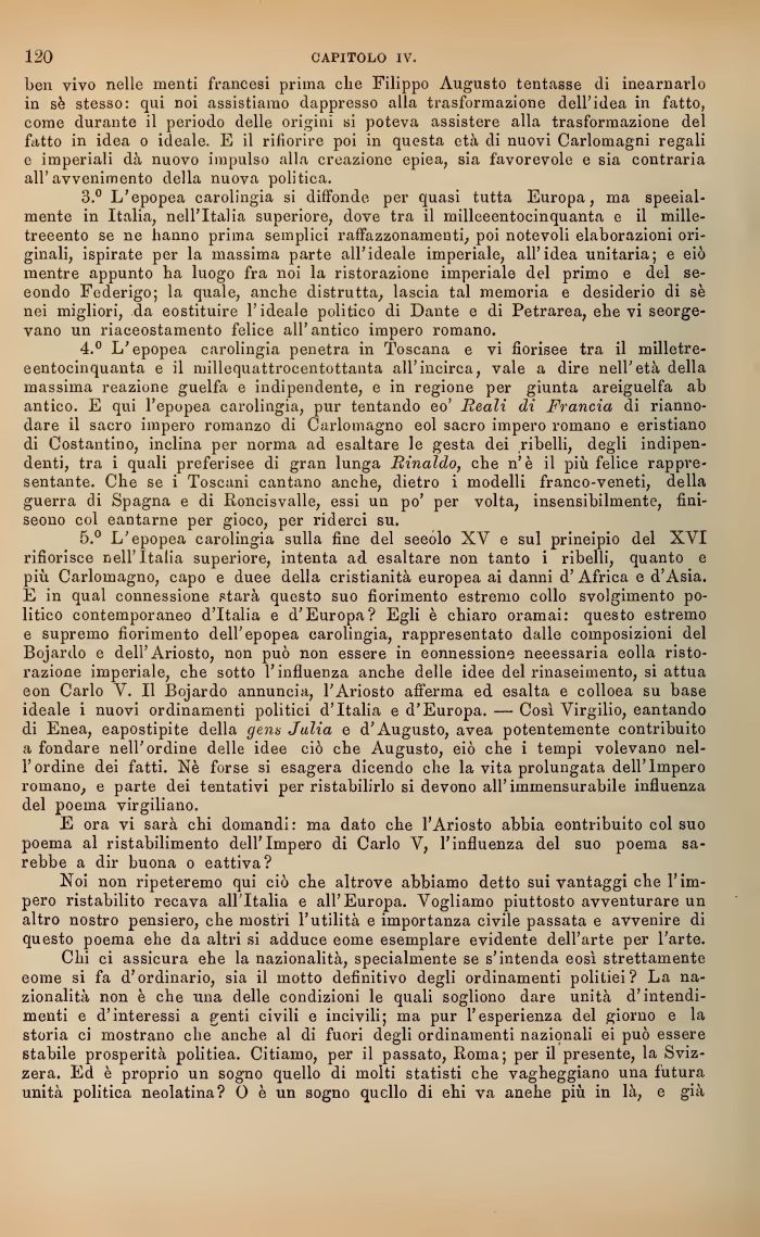 5.° L'epopea carolingia sulla fine del secolo XV e sul prineipio del XVI rifiorisce nell Italia superiore, intenta ad esaltare non tanto i ribelli, quanto e più Carlomagno, capo e duee della cristianità europea ai danni d' Africa e d'Asia. E m qual connessione starà questo suo fiorimcnto estremo collo svolgimento politico contemporaneo d'Italia e d'Europa? Egli è chiaro oramai: questo estremo e supremo fiorimcnto dell'epopea carolingia, rappresentato dalle composizioni del Bojardo e dell'Ariosto, non può non essere n connessione necessaria eolla ristorazione imperiale, che sotto l'influenza anche delle idee del rinascimento, s: attua eon Carlo V. Il Bojardo annuncia, l'Ariosto afferma ed esalta e colloea su base ideale i nuovi ordinamenti politici d'Italia e d'Europa. — Così Virgilio, eantando di Enea, capostipite della gens Julia e d'Augusto, avea potentemente contribuito a fondare nell'ordine delle idee ciò che Augusto, eiò che tempi volevano nell'ordine dei fatti Nè forse si esagera dicendo chc la vta prolungata dell'Impero romano, e parte dei tentativi per ristabilii lo b* devono all'immensurabile influenza del poema virgiliano.