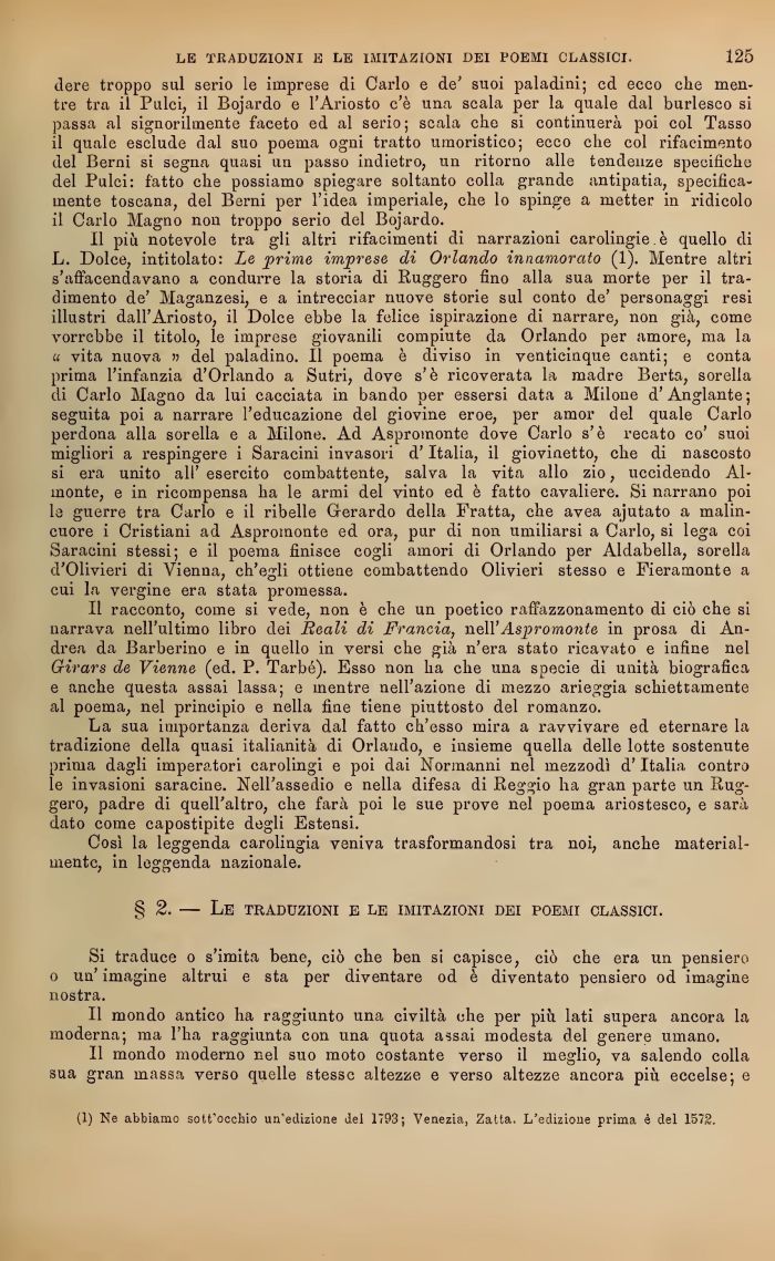 Il più notevole tra gli altri rifacimenti di narrazioni carolingie, è quello di L. Dolce, intitolato: Le prime imprese di Orlando innamorato (1). Mentre altri s'affacendavano a condurre la storia di Ruggero fino alla sua morte per il tradimento de' Maganzesi e a intrecciar nuove storie sul conto de' personaggi resi dlustri dall'Ariosto, il Dolce ebbe la felice ispirazione di narrare, non già, come vorrebbe il titolo, ie imprese giovani