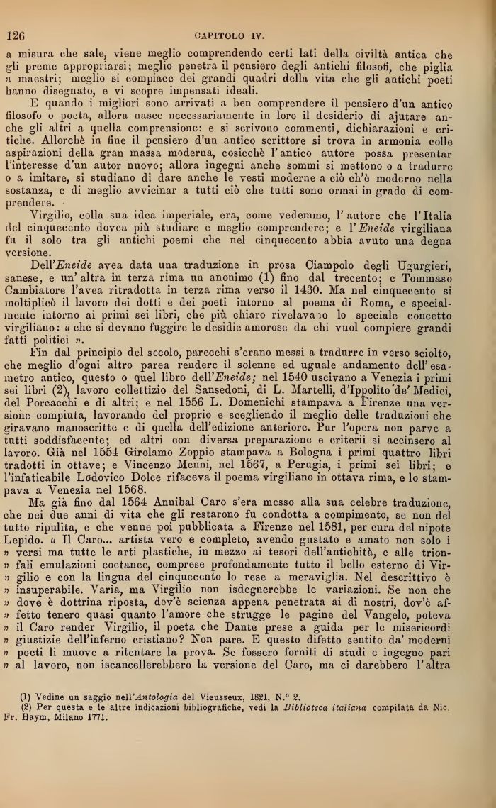 Ma già fino dal 1564 Annibal Caro s'era messo alla sua celebre traduzione, che nei due anni di -s ta che g.i restarono fu condotta a compi aento, se non del tutto ripulita, e che venne poi pubblicata a Firenze nel 1581, per cura del nipote Lepido, u II Caro... ar ista vero e completo, avendo gustato e amato non solo i n versi ma tutte le art plastiche, in mezzo ai tesori dell'antich. à, e alle trion-» fali emulazion coetanee, comprese profondamente tutto il bello esterno di Vir-j> gilio e con la lingua del c mquccento lo rese a meraviglia. Nel descrittivo è » insuperabile. Varia, ma Virgilio non isdegnerebbe le variazioni. Se non che » dove è dottrina riposta, dov'è scienza appena penetrata a. dì nostri, dov'c af-H fetto tenero quas quanto l'amore che strugge le pagine del Vangelo, poteva ;> il Caro render Virgilio, il poeta che Dante prese a guida per le misericordi » giusti-io dell'inferno e istiano? Non pare. E questo difetto sent ;o da'moderni » poeti li muove a ritentare la prova. Se fossero forniti d studi e igegno pari r> al lavoro, non scancellerebbero la versione del Caro, ma ci darebbero l'altra