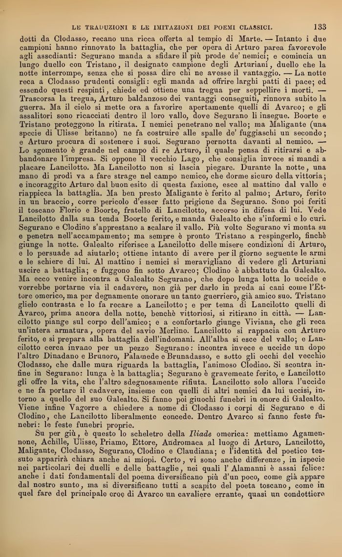Su per giù, è questo lo scheletro della Iliade omerica: mettiamo Agamennone, Achille, Ulisse, Priamo, Ettore, Andromaca al luogo di Arturo, Lancilotto, Maligante, Clodasso, Segurano, Clodino e Claudiana; e l'identità del poetico tessuto apparirà chiara anche ai miopi. Corto, vi sono anche differenze, in specie nei particolari dei duelli e delle battaglie, nei quali l'Alamanni è assai felice: anche i dati fondamenta! del poema diversiùcano più d'un poco, come g'i appare dal nostro sunto, ma s diversificano tutti a scapito del poeta toscano, come in quel fare del principale eroe di Avarco un cavaliere errante, quasi un condottiero