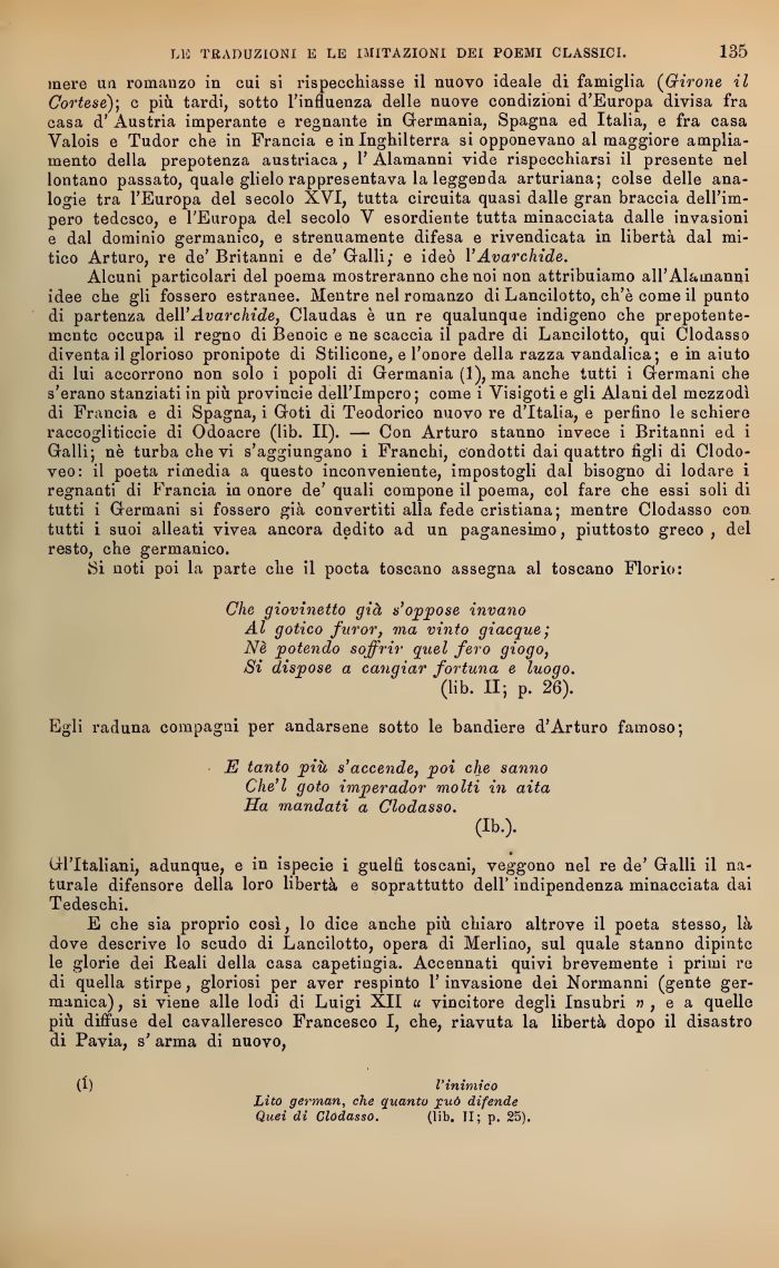 Alcuni particolari del poema mostreranno che noi non attribuiamo all'Alamanni idee che gli fossero estranee. Mentre nel romanzo di Lancilotto, ch'è come il punto di partenza dell'Avarchide, Claudas è un re qualunque indigeno che prepotentemente occupa il regno di Benoic e ne scaccia il padre di Lancilotto, qui Clodasso diventa il glorioso pronipote di Stilicone, e l'onore della razza vandalica; e in aiuto di lui accorrono non solo i popoli di Germania (1), ma anche tutti i Germani che s'erano stanziati in più provincie dell'Impero; come i Visigoti e gli Alani del mezzodì di Fran»- a e di Spagna, i Goti di Teodorico nuovo re d'Italia, e perfino le schiere raccogliticcie di Odoacre (lib. II). — Con Arturo stanno invece i Britanni ed i Galli; nè turba che vi s'aggiungano i Franchi, condotti dai quattro figli di Clodo-veo: il poeta rimedia a questo inconveniente, impostogli dal b.sogno di lodare i regnanti di Franeia in onore de' quali compone il poema, col fare che essi soli di tutti i Germani si fossero già convertiti alla fede cristiana; mentre Clodasso eon. tutti i suoi alleati vivea ancora dedito ad un paganesimo, piuttosto greco , del rosto, che germanico.