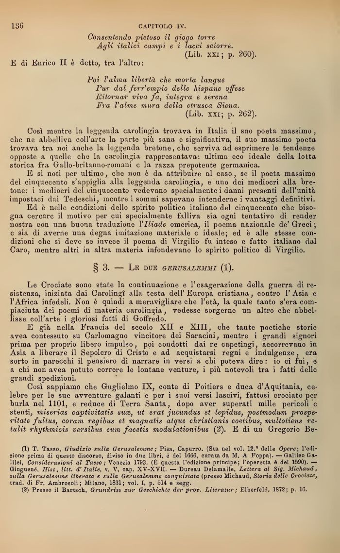 (1) T. Tasso, Giudizio sulla Gerusalemme ; Pisa, Capurro. (Sta nel voi. 12.' delle Opere ; l'edizione prima di questo discorso, diviso in due libri, è del 1(566, curata da M. A Foppa). — Galileo Galilei, Considerazioni al Tasso ; Venezia 1793. (È questa l'edizione principe; l'operetta è del 1590). — Ginguend, Ilist, litt. d'Italie, v. V, cap. XV-XVII. — Dureau Delamalle, Lettera al Sig. Michaud, sulla Gerusalemme liberata e sulla Gerusalemme conquistata (presso Michaud, Storia delle Crociate, trad. di Fr. Ambrosoli ; Milano, 1831; voi. I, p. 511 e segg.