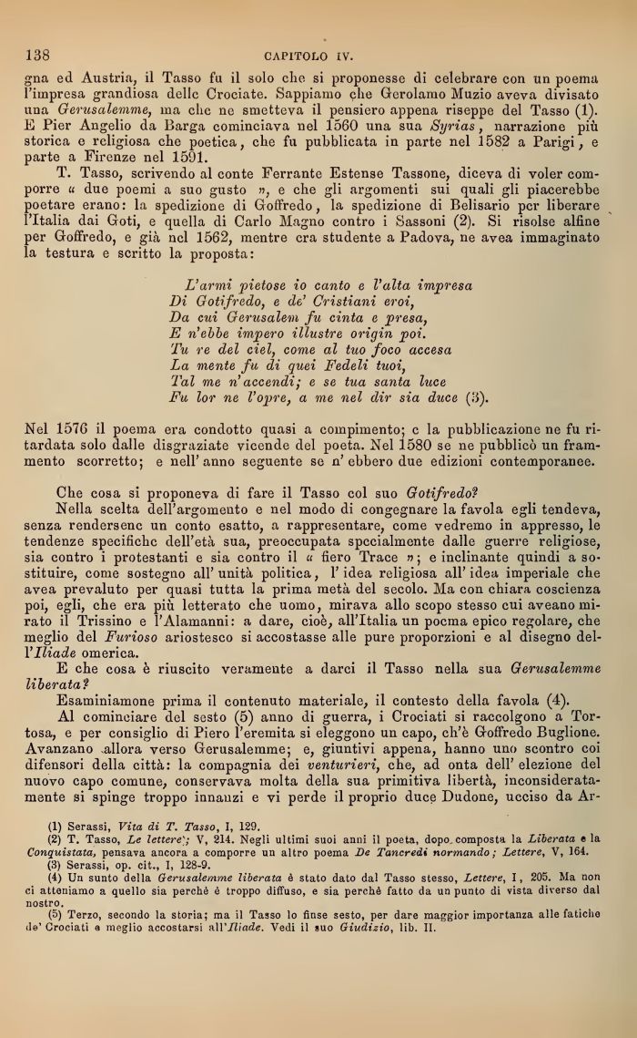 (4) Un sunto della Gerusalemme liberata è stato dato dal Tasso stesso, Lettere, 1, 205. Ma non ci atteniamo a quello sia perchè è troppo diffuso, e sia perchè fatto da un punto di vista diverso dal nosti o.