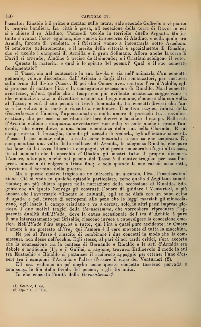 Il Tasso, sia nel contessere la sua favola e sia nell' animarla d'un concetto generalo, voleva discostarsi dall'Ariosto c dagh altri romanzatori, per mettersi sulle orme del divino Omero. E poi che Omero avea cantato l'ira c Achille, egli si propose di cantare l'ira e la conseguente secessione di Rinaldo. Ma il concotto ariostesco, ch'era quello che i tempi con più evidente insistenza suggerivano e che cominciava anzi a diventare oramai un luogo comune, s'impose alla sua volta al Tasso; e coóì il suo poema si trovò dominato da due concetti diversi che l'autore ha voluto e in parte c riuscito a combinare. 11 motivo tragico, infatu, della Gerusalemme è l'amore, l'appassionato e molle amore di parecchi tra i cavalieri cristiani, che per esso si scordano dei loro doveri c lasciano il campo. Nelle reti d'Armida cadono i cinquanta avventurieri non solo; vi cade anche il prode Tancredi, che corre dietro a una falsa sembianza della sua bella Clorinda. E sul campo stesso di battaglia, quando gl accade d vederla, egli all'istante si scorda d' esser lì per menar colpi, c resta eome incantato e non sa che sospirare. E, compiaciutosi una volta delle mollezze di Armida, lo sdegnoso Rinaldo, che pure dai lacci di lei avea liberato i compagni, vi si perde smemorato d'ogni altra cosa, fin al momento che lo specchio d' Ubaldo gli mostri tutto il proprio disonore. L'amore, adunque, anche nel poema del Tasso è il motivo tragico: per esso l'impresa minaccia di volgere a tristo fine; e solo quando le sue catene sono rotte, s'avvicina il termine della guerra.