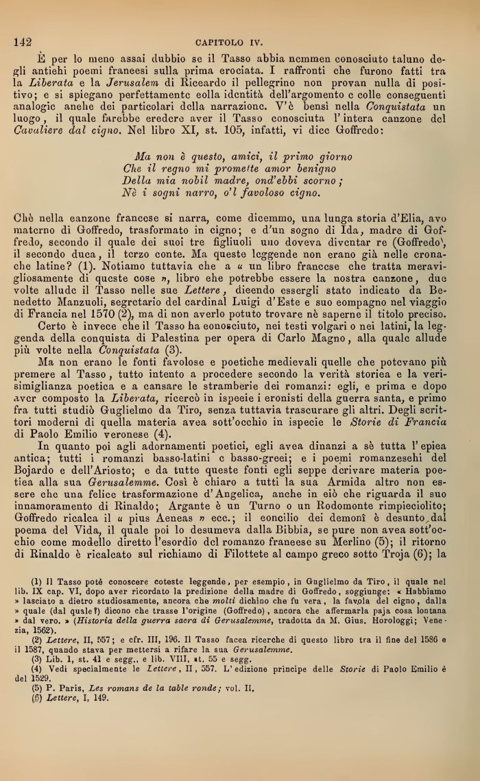 Chò nella eanzone francese si narra, come dicemmo, una lunga storia d'Elia, avo materno di Goffredo, trasformato in cigno; e d'un sogno di Ida, madre di Goffredo, secondo il quale dei suoi tre figliuoli uuo doveva diventar re (Goffredo'*, il secondo duca, il terzo conte. Ma queste leggende non erano già nelle cronache latine? (1). Notiamo tuttavia che a u un libro francese che tratta meravigliosamente di queste cose », libro ehe potrebbe essere la nostra canzone, duo volte allude il Tasso nelle sue Lettere, dieendo esserg ¦ stato idicato da Benedetto Manzuoli, segretario del cardinal Luigi d'Este e suo eompaguo nel viaggio di Francia nel 1570 (2), ma di non averlo potuto trovare nè saperne il 1 tolo preciso.