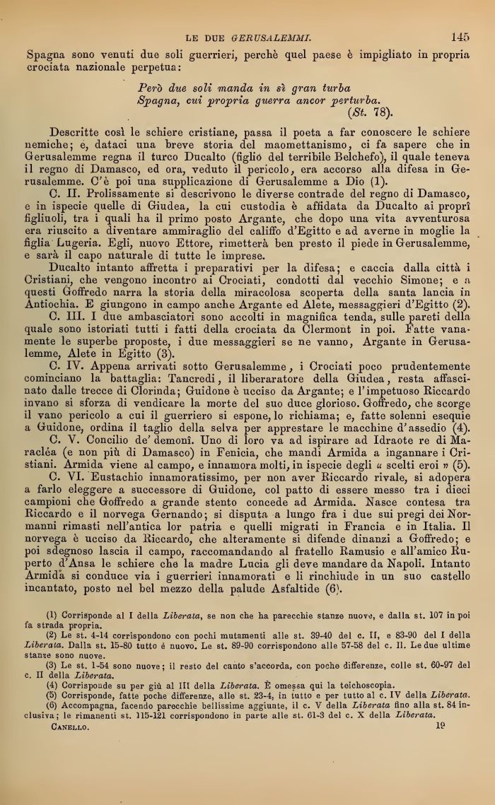 (6) Accompagna, facendo parecchie bellissime aggiunte, il c. V della Liberata tino alla st. 84 n-clusiva; le rimanenti st. 115-121 corrispondono in parte alle st. 61-3 del c. X della L beraia.