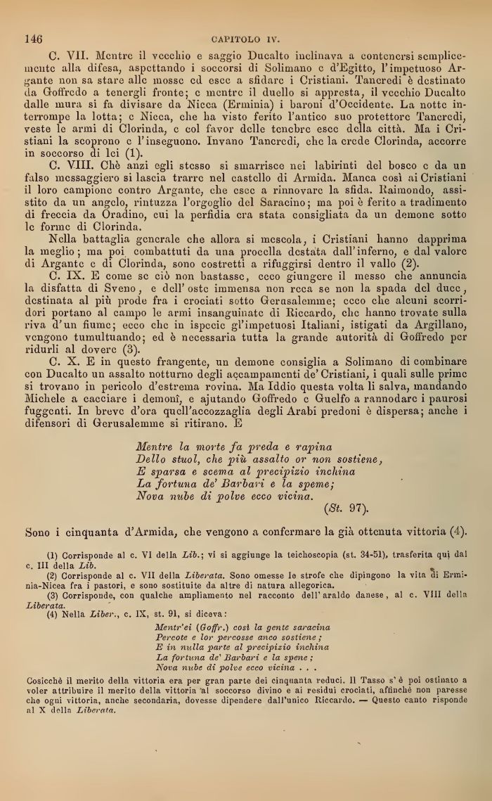 (2) Corrisponde al c. VII della Liberata. Sono omesse le strofe elle dipingono la vita di Ermi-nia-Nicea fra i pastori, e sono sostituite da altre di natura allegorica.